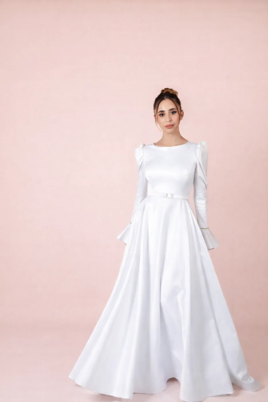 שמלת כלה אלגנטית בגזרה קלאסית ונקייה. שרוולים ארוכים עם נפח עדין בכתפיים וחגורה דקה במותן. חצאית מתרחבת באלגנטיות עד הרצפה למראה יוקרתי וצנוע. ✨